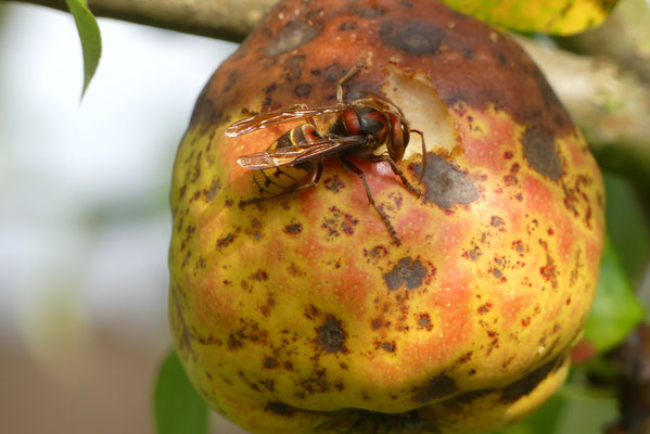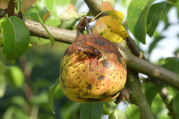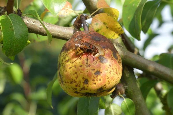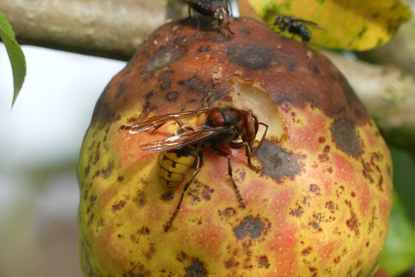 Hornissen sind überwiegend Insektenfresser, aber sie knabbern auch sehr gern in den Monaten von August bis Oktober reifes Obst an. Das kann für manchen Obstbauern sehr ärgerlich werden.